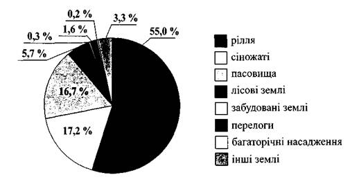 Рис. 9.1. Структура осушених земель України станом на 1.01.2006 р. Переважну частину у структурі осушених земель займають сільськогосподарські землі (90,8 % від площі осушених земель). Серед сільськогосподарських угідь найбільша площа зайнята під ріллею (55,0 % - 1 818,3 тис. га), сіножаті (17,2 % - 567,1 тис. га), пасовища (16,7 % - 517,4 тис. га). Також у складі осушених земель 188,5 тис. га (5,7 %) займають лісові землі, 9,7 тис. га (0,3 %) - забудовані землі, 51,5 тис. га (1,6 %) - перелоги, 8,1 тис. га (0,2 %) - багаторічні насадження. Заходи осушувальної меліорації проводились практично у всіх адміністративно-територіальних утвореннях, крім АР Крим, Дніпропетровської, Запорізької, Кіровоградської, Миколаївської, Херсонської областей, міст Київ і Севастопіль (таблиця 9.1).