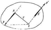 или Парой сил, называются две равные и параллельные силы, направленные в противоположные стороны. Положим, что мы имеем две равные и параллельные силы Р и Р', направленные в противоположные стороны. Проведем прямую, перпендикулярную к линиям действия этих сил и пересекающую эти линии в точках А и В (рис. 6). Длину перпендикуляра АВ называют плечом пары.