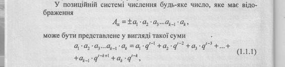 де k — кінцева кількість розрядів у відображенні числа; ai — цифра і-го розряду; g— основа системи числення; t — фіксоване число, яке визначає положення коми; і — порядковий номер розряду; g t-i — вага i-го розряду. Цифри ai повинні задовольняти нерівності