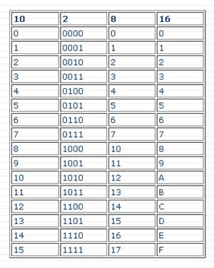 Нижче в таблиці 1 наведені перших 16 натуральних чисел записаних в десятковій, двійковій, вісімковій та шістнадцятковій системах числення. Таблиця 1