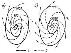 Сила трения оказывает влияние и на ветер, дующий вдоль замкнутых изобар (градиентный). Скорость ветра также будет отклонятся влево от изобар (по барическому градиенту). Поэтому в Северном полушарии циклоне ветер в нижней части будет дуть против часовой стрелки, оттекая от периферии к центру. В антициклоне в нижних слоях ветер будет направлен по часовой стрелке и выносить воздух от центра к периферии (рисунок 59).