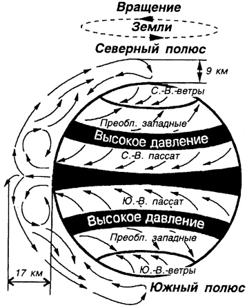 Область высокого атмосферного давления вблизи полюсов и область низкого давления вблизи экватора, появление которых связано с термическими условиями (температурным режимом) называются термическими максимумами и минимумом. По образному выражению Шулейкина В.В., на экваторе находится нагреватель, а на полюсах – холодильники. Они создают тепловую машину, первого рода, вызывающую межширотный обмен воздуха. Термическая разница между широтами вызывает меридиональную составляющую атмосферной циркуляции. Вращение Земли. При решении теоретических задач по общей циркуляции атмосферы скорость вращения Земли обычно принимается постоянной, хотя установлено, что она подвержена сезонным и внутрисезонным изменениям. Вследствие вращения Земли значительно усложняется рассмотренная выше схема. В действие вступает отклоняющая сила Кориолиса. Массы воздуха, растекающиеся в верхних слоях атмосферы от экватора постепенно отклоняются в северном полушарии вправо, в южном – влево (так возникает зональная составляющая циркуляции атмосферы). На широтах 20–30° их движение становится параллельным экватору, и дальше им заворачивать некуда: подпирает идущий от экватора воздух. Воздуху как бы становится тесно, создаются полосы высокого атмосферного давления, образование которых связано с характером движения воздуха, а не с его температурой. Поэтому она называется динамическими областями высокого давления, от приполярных термических мах они отделяются динамическими областями относительно пониженного атмосферного давления (рисунок 69).