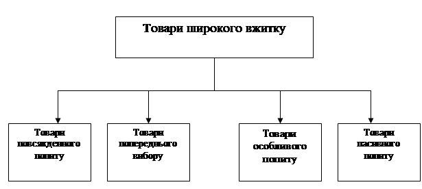 Товари широкого вжитку: · Товари повсякденного попиту – це товари, які купують часто, без особливих роздумів та з мінімальними зусиллями щодо порівняння їх між собою. Це, зокрема, хліб, мило, цукерки, сигарети тощо. Їх також поділяють: товари постійного попиту(купують регулярно), товари імпульсивної купівлі(гумка, запальничка), товари для нагальних потреб (парасолька) · Товари попереднього вибору – це товари, які покупець ретельно вибирає, порівнює між собою за показниками якості, ціни, зовнішнього оформлення тощо. До них належать одяг, взуття, посуд, електроприлади. · Товари особливого попиту – престижні дорогі товари, товари з унікальними характеристиками,або товари певної торгової марки до придбання яких покупці ладні докласти додаткових зусиль. Такими вважають автомобілі, предмети антикваріату. · Товари пасивного попиту – це товари, про які покупець нічого не знає, а якщо і знає, то, як звичайно не думає про їх придбання. Це, наприклад, страхові послуги, для реалізації яких потрібні значні зусилля з боку продавців. Принципові товарні новинки, перебувають у стані пасивного попиту доти, доки інтенсивна реклама не познайомить споживачів із вигодами їх використання. Наведена класифікація товарів широкого вжитку допомагає маркетологом обрати правильну стратегію просування цих товарів з урахуванням специфіки процесу прийняття споживачем рішення про купівлю.