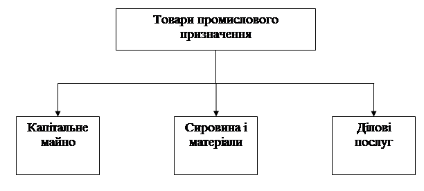 На промисловому ринку товари класифікують на підставі того, яку участь вони беруть у виробничому процесі, якою є тривалість їх використання і відносна вартість. Товари промислового призначення: 1. Капітальне майне використовується у процесі виробництва як засоби праці. Ця група охоплює: - будівлі і споруди; - основне обладнання; - допоміжне обладнання. 2. Сировину й матеріали використовують у процесі виробництва як предмет праці. До них належать: - природна і сільськогосподарська сировина; - основні матеріали (наприклад, залізо, пряжа, цемент) - допоміжні матеріали (для технічного обслуговування і ремонту тощо) - комплектувальні вироби, які входять у кінцевий продукт як його складові. 3. Ділові послуги, які поділяють на: - послуги з технічного обслуговування і ремонту - послуги консультативного характеру (консультації з питань права, аудиторські послуги,маркетингові дослідження тощо).