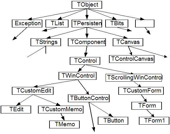 Классы в Delphi Лекция 24 Delphi имеет обширный набор классов. Фрагмент структуры классов Delphi приведен на рис.5.24.1. Предком всех классов Delphi является класс TObject. Он обладает самыми общими методами присущими любому объекту Паскаля. Этот класс описывает основные принципы поведения объектов во время работы программы (создание, уничтожение, обработка событий и так далее).