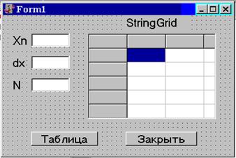 Пример: вывод массивов чисел в Memo. Пусть необходимо рассчитать таблицу значений функции (например у=х*х). В качестве исходных данных будем задавать значения Xn, Dx и N - начальное значение аргумента, шаг и количество значений функции соответственно. Значения аргумента и функции будем заносить в массивы ХА и У соответственно. Выберем размер массивов равным 50 элементов. Вывод массивов будем делать в компонент Memo. Таким образом форма должна содержать компонент Memo, поля Edit для ввода значений Xn, Dx, N и две кнопки: "Таблица" и "Закрыть". При щелчке на кнопке "Таблица" вычисляется массив значений функции У = Х * Х и выводится таблица (значения Х и У) в компонент Memo. При щелчке на кнопке "Закрыть" приложение закрывается. Проект формы показан на рис.5.25.1.