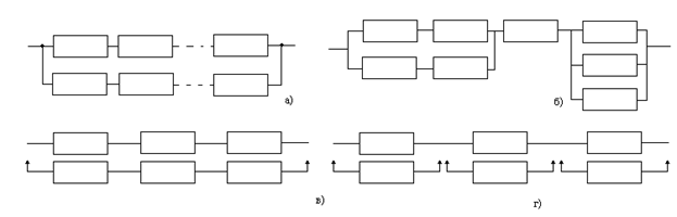 Схемы общего (а) и поэлементного (б) постоянного резервирования приведены на рис. 3.4. При постоянном включении основные и резервные элементы (подсистемы) функционируют одновременно, начиная с момента включения системы (рис. 3.4, а и б). Постоянное резервирование является пассивным. При включении замещением (рис. 3.4, в и г), которое является активным резервированием, резервные элементы (подсистемы) включаются в работу только после отказа основных. До этого они находятся в состоянии хранения (ненагруженный резерв), частично включены (облегчённый резерв) или полностью включены (нагруженный резерв). При нагруженном резерве резервные элементы имеют интенсивность отказов
