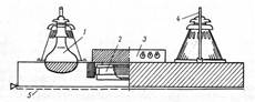 Рис. 3. Опромінював установки ИКУФ-1 1 – інфрачервона лампа; 2 – еритемна лампа; 3 – кожух пускорегулюючого апарату з перемикачами; 4 – підвіска; 5 – захисна решітка До складу однієї установки ИКУФ-1М входить 40 опромінювачів, силовий щиток і блок програмного керування. Кожен опромінювач (рис. 3) має дві інфрачервоні лампи типу ИКЗК-220-250 і одну ультрафіолетову лампу ЛЭ-15, які змонтовані в загальній арматурі разом з пусковою апаратурою для лампи ЛЭ-15. Один опромінювач забезпечує обігрівання і опромінювання поросят-сисунів у двох станко-місцях, а телят — в одному станко-місці. Принципіальну електричну схему установки ИКУФ-1М зображено на рис.4. В схемі передбачено ручне і автоматичне керування. При ручному керуванні тумблери SА1 і SА2 встановлюють у положення «А». Якщо подати на схему напругу, то спрацює реле часу КТ1 типу 2РВМ і через свої контакти подасть напругу на котушки електромагнітних пускачів KМ1 і КМ2. Пускачі спрацюють і ввімкнуть інфрачервоні та ультрафіолетові лампи. Ультрафіолетові лампи розраховані на напругу 127 В і живляться від спеціальних трансформаторів. Програмне реле регулюють на потрібний режим роботи, і воно автоматично підтримує потрібну тривалість роботи ламп.
