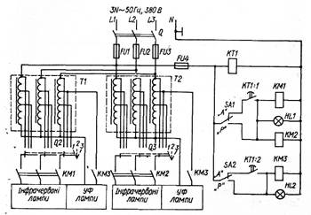Рис. 6. Принципіальна електрична схема установки «Луч» Принципіальна електрична схема установки «Луч» зображена на рис. 6. Схема забезпечує ручне і автоматичне керування. При ручному керуванні вмикають і вимикають інфрачервоні лампи перемикачем SА1, а необхідну напругу на лампах встановлюють перемикачами Q2 і Q3. При автоматичному керуванні перемикач SА1 встановлюють у положення «А». Після цього перемикачами Q2 і QЗ встановлюють необхідну напругу для інфрачервоних ламп. Тривалість періодів роботи і перерв регулює реле часу типу 2РВМ, яке має дві програми. Ручне керування лампами ЛЭ-15 здійснюють вимикачем SА2. При автоматичному керуванні лампами ЛЭ-15 перемикач SА2 встановлюють у положення «А», а режим роботи забезпечує друга програма реле часу 2РВМ (контакт К.Т1: 2) відповідно до заданої добової дози.