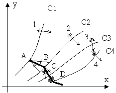 Рис. 1. Ізокліни С1, С2, С3, С4 (1,2,3,4 – дотичні до ізоклін, ABCD – фазова траєкторія)