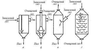 Конструкції інерційних пиловловлювачів показані на рис. 2. Інерційні апарати здатні вловлювати частинки за розмірами більшими ніж 25 – 30 мкм, ступінь очистки 60-70% Інерційні апарати використовують, головним чином, для попередньої грубої очистки газів. В жалюзійних пиловловлювачах пил виділяється з газового потоку під дією інерційних сил, але зміна напрямку руху потоку здійснюється за допомогою жалюзійних пластин або кілець. Циклони. Відокремлення частинок пилу від газу у циклоні полягає у використанні відцентрової сили, яка виникає під час обертального руху газового потоку. Циклонні апарати найбільш поширені у промисловості. Це обумовлено відносно простою їх конструкцією, незначним гідравлічним опором, малими габаритами і високою продуктивністю. Класичний варіант циклону містить наступні складові частини (рис. 3): циліндричний корпус 3 з кришкою 5 і тангенціально розміщеним патрубком 4 для введення запиленого газу; конус 2 з патрубком для виведення пилу; центральну трубу 7 з патрубком 6 для виведення очищеного газу; пилезбірник 1. Розміри і геометричні форми позначених елементів в існуючих циклонах можуть бути різні; крім цього, деякі з них мають додаткові конструктивні елементи, наприклад, закручуючи гвинти, розетки та інші пристрої для закручування газу. Запилений газ поступає в циклон через тангенціально розміщений патрубок, внаслідок чого він набуває обертового руху. Після 2 – 3 обертів у кільцевому зазорі між корпусом і центральною трубою газ гвинтоподібно опускається вниз, при цьому в конічній частині внаслідок зменшення діаметра швидкість обертання потоку збільшується. Під дією відцентрової сили частинки пилу відкидаються до стінок циклону, внаслідок чого основна їх маса зосереджується в потоці газу, який рухається безпосередньо біля стінок апарата. Газовий потік переміщається в нижню частину конуса, змінює напрямок руху на 1800 і по центральній трубі виходить з апарата. Частинки пилу за інерцією продовжують рухатися вздовж стінок конуса і попадають у пилезбірник.