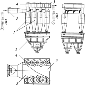 Групові та батарейні циклони. Збільшення діаметра циклонів за постійної тангенціальної швидкості вхідного газу приводить до зменшення відцентрової сили, а відповідно, і до зменшення ефективності очищення. Тому збільшувати розміри промислових циклонів вище певних меж недоцільно. Крім цього, поодинокі циклони навіть значних розмірів мають порівняно малу продуктивність. В цей самий час, у промисловості очищують гази, витрати яких досягають декількох сот тисяч метрів кубічних за годину. В таких випадках для очищення газів використовують групові циклони, які складаються з декількох окремих циклонів. Як приклад, на рис. 4 зображений груповий циклон з дворядним розміщенням окремих циклонів. Запилений газ подається через загальний колектор одночасно у всі циклони 1. Вхід газу в циклони тангенціальний. На кінцях центральних труб циклонів 4, з’єднані з колектором закріплені спіралеподібні камери 5 для виведення очищеного газу. Осаджений у циклонах пил збирається в бункері 2. Загальна продуктивність групового циклону приблизно дорівнює добутку продуктивності одного циклону на кількість циклонів. Наприклад, циклон ЦН-15 діаметром 400 мм має продуктивність 1500 м3/год., а груповий циклон, який складається з 16 циклонів ЦН-15, має продуктивність 28500 м3/год.