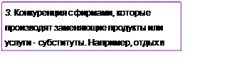 2 этап: модель пяти сил конкуренции. Конкурентная среда состоит из конкуренции между фирмами внутри отрасли. Силы конкуренции: 1. Внутриотраслевая конкуренция между действующими на рынке организациями. 2. Конкуренция со стороны фирм из других отраслей, которые могут войти на рынок. 3. Конкуренция с фирмами, которые производят заменяющие продукты или услуги - субституты. Например, отдых в Турции и отдых в Крыму. 4. Потребители 5. Поставщики.