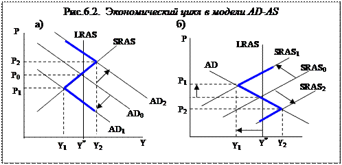 На рис.6.2. цикл представлен графически с помощью модели AD-AS. На рис.6.2.а показан экономический цикл, обусловленный изменениями совокупного спроса (совокупных расходов), а на рис.6.2.б – изменениями совокупного предложения (совокупного выпуска). В условиях, когда спад в экономике вызывается не сокращением совокупного спроса (совокупных расходов), а уменьшением совокупного предложения, большинство показателей ведут себя так же, как и в первом случае (реальный ВВП, уровень безработицы, величина совокупных доходов, запасы фирм, объем продаж, прибыль фирм, налоговые поступления, объем трансфертных выплат и др.) Исключение составляет показатель общего уровня цен, который повышается по мере углубления спада (рис.6.2.б). Это ситуация «стагфляции» - одновременного спада производства (от Y* до Y1) и роста уровня цен (от Р0 до Р1). Основу для выхода из подобного спада также составляют инвестиции, так как они увеличивают запас капитала в экономике и создают условия для роста совокупного предложения (сдвиг кривой SRAS1 вправо до SRAS0).