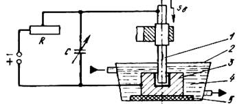 Схема электроискрового станка: 1 – электрод-инструмент; 2 – ванна; 3 – электрод-заготовка; 4 – диэлектрическая жидкость; 5 – изолятор