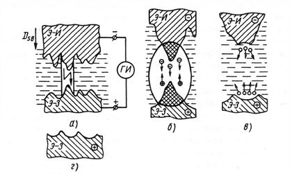 Режимы электроимпульсной и электроискровой обработки существенно различны. При электроимпульсной обработке применяют пониженные напряжения и относительно большие значения средних токов, а частота тока, питающего разрядный межэлектродный промежуток, стабильна. Электроискровая обработка отличается широким диапазоном режимов обработки — от черновой производительностью 1,5 — 10 мм3/с при шероховатости обработанной поверхности Rz = 160 - 40 мкм до отделочной производительностью около 0,001 мм3/с при шероховатости поверхности Ra = 1,25 - 0,16 мкм. Характерные черты этого процесса: сравнительно низкая производительность обработки, большой износ электрод-инструментов, применение преимущественно релаксационных схем генерирования импульсов длительностью 10 — 200 мкс при частоте 2 — 5 кГц, использование прямой полярности, образование на обрабатываемой поверхности тонкого дефектного слоя толщиной 0.2 — 0.5 мм на черновых и 0.02 — 0,05 мм на чистовых режимах. Значительный износ электродов ограничивает технологические возможности этого метода.
