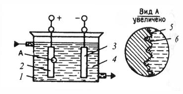 Схема электрохимического полирования: 1-ванна; 2-обрабатываемая заготовка; 3-пластина-электрод; 4-электролит; 5 микровыступ; 6-продукт анодного растворения.