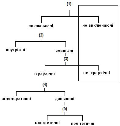 Рис.1. Послідовності вибору чисельних класифікацій. Виключаючі / не виключаючі. Виключаючі – кожен елемент може бути лише в одній підмножині. Не виключаючі – один елемент може бути в різних підмножинах. Внутрішні / зовнішні. Внутрішні – класифікація основана лише на заданому наборі ознак і всі ознаки на початковому етапі вважаються рівнозначними. Зовнішні – одна з ознак є зовнішньою і задача полягає в тому, щоб, використовуючи лише інформацію про решту внутрішніх ознак, отримати класифікацію, яка найкращим чином відображає зовнішню ознаку. Ієрархічні / не ієрархічні. Ієрархічні – групи розглядають попарно як можливі кандидати для об’єднання, за умови критерію найменшого збільшення неоднорідності. Не ієрархічні – групи вибираються так, щоб кожна була по можливості більш однорідною але відношення між групами невияснені. Агломеративні / дивізивні. Агломеративні (лат. agglomero – нагромаджувати, накопичувати; скупчення) – об’єкти об’єдуються в множини зростаючого об’єму, поки не відбудеться об’єднання в одну множину. В дивізівному (лат. divisio – поділ, розділ) – вихідна множина поступово ділиться, поки не буде досягнуте бажане розділення. Монотетичні і політетичні. Монотетичні – поділ здійснюється на основі однієї ознаки, яка має максимальну інформативність. В політетичній всі ознаки враховуються однаковою мірою. Агломеративні стратегії завжди політетичні. На початку класифікації всі ознаки вважаються рівноправними, але після класифікації може виявитись, що вклад отриманий в результаті класифікації за різними ознаками – різний. Виникає потреба в діагностичній системі, яка б слідкувала за ходом класифікації і видавала б впорядкований список вкладів ознак для кожного чергового об’єднання чи розділення.