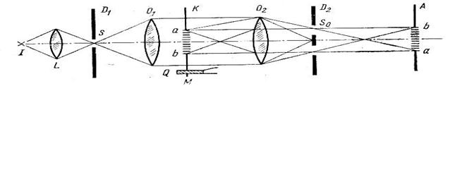 Рис. 2 Щель S освещается источником света I через линзу L, фокус которой совпадает с S. Линза Измерение скорости звука с помощью эха используется в одном из так называемых импульсных методов. Впервые ультраакустические импульсы в практике исследований применил С. Я. Соколов для изучения распространения звука в твердых телах. Колебание кварца возбуждается генератором, посылающим не непрерывную волну, а кратковременный импульс, состоящий из нескольких быстро затухающих электромагнитных волн. Импульс, поданный на кварц, одновременно подается на вертикальные пластины осциллографа Е, и в момент возникновения колебаний кварца на экране осциллографа появляется резкий «всплеск». Импульс распространяется от кварца через исследуемую среду до отражателя (рис. 2) и возвращается обратно к кварцу. Работа генератора рассчитывается так, чтобы к моменту возвращения отраженного импульса кварц находился в покое. Тогда вернувшийся импульс возбуждает колебания кварца, который в этот момент соединяется с осциллографом, и на экране появляется второй «всплеск». На экранe, таким образом, видны два «всплеска»: один, соответствующий моменту посылки импульса, другой — моменту возвращения его после отражения. На пластины осциллографа подаются от специального генератора импульсы высокой частоты, создающие на экране осциллографа невысокие «всплески», отстоящие друг от друга на равных расстояниях. Они служат отметками времени. Зная их частоту, можно отсчитать время t пробега импульса. Тогда скорость звука рассчитывается по формуле (5), где