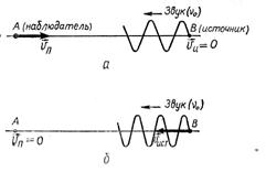 Когда источник и приемник звука неподвижны относительно среды, в которой распространяется звук, то частота колебаний, воспринятых приемником, будет равна частоте ν0 колебаний источника. Скажется ли на восприятии звука (его частоты) движение источника или приемника? Доплер в 1842 г. установил, что частота ν воспринимаемого звука зависит как от скорости движения источника (относительно среды), так и от скорости движения наблюдателя: она выше частоты ν0 источника, если наблюдатель и источник сближаются, и ниже ν0, если они удаляются. В этом состоит эффект Доплера. Выясним причину этого явления. Для простоты положим, что приемник и источник движутся вдоль соединяющей их прямой. Скорость источника υи и скорость приемника υn (относительно среды) будем считать положительными, если источник и приемник сближаются, и отрицательными, если они удаляются. Рис.1 Пусть наблюдатель (приемник) движется в сторону источника (υн>0), а источник неподвижен (рис.1а). Если бы наблюдатель покоился, то за 1 с через него прошло бы число волн, равное