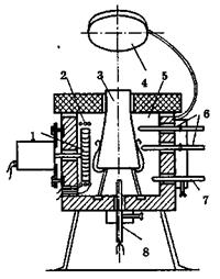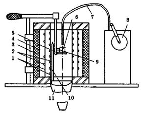 Рис. 2.10. Схема приладу для визначення температурних показників пожежної небезпеки твердих речовин і матеріалів: 1 - скляні циліндри; 2 - спіральні електронагрівачі; 3 - теплоізоляція; 4 - стальний екран; 5 - тримач зразка; 6 - сталевий контейнер; 7 - газовий пальник; 8 - кривошипний механізм; 9-10 - термопари; 11 - ежектор