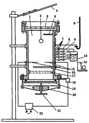 Рис. 2.14. Схема установки «Предел-2» для вимірювання концентраційних меж поширення полум'я: 1 - реакційна посудина; 2 - отвір для продування; 3 - верхня кришка; 4 - оглядове дзеркало; 5 - термопари; 6 - ртутний манометр; 7 - трубопроводи; 8-12 - клапани; 13 - випарювач; 14 - вакуумний насос; 15 - електроди запалювання; 16 - трубчатий електронагрівач; 17 -пакет сіток; 18 - кінцевий вимикач; 19 - нижня кришка; 20 - коромисло; 21 - гвинт; 22 -високовольтне джерело живлення