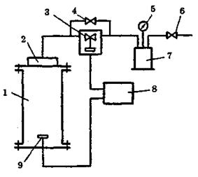 Рис. 2.15. Схема установки для вимірювання НКМП аерозависей: 1 - реакційна посудина; 2 - розпилювач; 3 - електромагнітний клапан; 4 -клапан; 5 - манометр; 6 - клапан; 7 - ресивер; 8 - блок керування; 9 - джерело запалювання Схематично концентраційні межі поширення полум'я показані на рис. 2.16. Розглянемо деякі спрощені методи розрахунку нижніх концентраційних меж поширення полум'я.