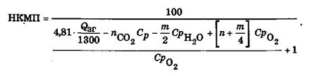 де Тг ‑ температура горіння; QЗГ ‑ нижча молярна теплота згоряння; ΣCpjGi - сума добутку теплоємностей продуктів горіння на їх вміст (в молярних частках). З наведеної формули вираз для НКМП (% об.):