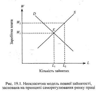 Неокласична теорія зайнятості: гнучкі ціни праці. Розглянемо основні теорії зайнятості за умов ринкової економіки. Представники неокласичної школи (Д. Гілдер, А. Лаффер) уважають, Так, наприклад, заробітна плата через певні причини зросте з W1 до W2, що приведе до підвищення пропонування праці до L2 (пропонувати робочу силу будуть і ті, хто займається домогосподарством, тощо). Пропонування праці зросте від L1 до L2, що викличе надлишок зайнятих, а фактично, штучно сформує безробіття в країні. Це призведе до зниження ціни праці на ринку з W1 до W2. На рис. 19.1 повна рівновага на ринку праці досягається в точці Е, де крива пропонування робочої сили S перетинається з кривою попиту на неї D роботодавців. Заробітна плата W1 виступає як рівноважна. За даного рівня заробітної плати в економіці досягається повна зайнятість L1 — попит на працю дорівнює пропонуванню праці. Аналогічну позицію займають прихильники теорії раціональних сподівань. Ця теорія передбачає, що крива сукупного пропонування праці S вертикальна, а заробітна плата та інші ціни — гнучкі (рис. 19.2). Зниження заробітної плати і цін, якщо таке станеться, не приведе до вимушеної незайнятості робочої сили, через певний час зайнятість швидко відновиться на новому (нижчому) рівні цін.