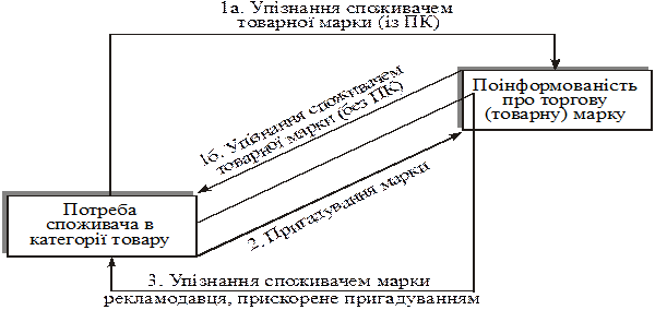Покупець подумки пов’язує (а рекламне звернення має так зробити) упізнання та пригадування торгової марки з потребою в категорії (рис. 8.1). Наведена схема взаємозв’язку поінформованості про торгову марку та потребу в категорії працює так: