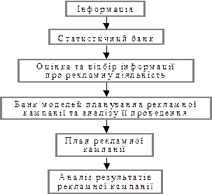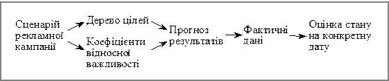 Модель рекламного процесу — це умовне зображення діяльності окремих учасників рекламного бізнесу відповідно до їхніх характеристик. Вона відбиває весь цей процес, тому її призначення полягає в тім, щоб якомога точніше побудувати (змоделювати) перебіг рекламної діяльності й поведінку її учасників. Статичні моделі описують не процес, а лише окремі співвідношення між параметрами рекламної діяльності підприємства, зафіксовані на певний визначений час. Динамічні моделі враховують реальні параметри, а тому дають змогу показати перебіг процесу функціонування та розвитку рекламної діяльності. За способом математичного описування досліджувані процеси поділяються на аналітичні й алгоритмічні. В аналітичних моделях процеси функціонування рекламного бізнесу подаються у вигляді алгебраїчних виразів, систем рівнянь і систем обмежень змінних. Алгоритмічні моделі поєднують традиційні математичні форми описування процесів у рекламному бізнесі з логічними та логіко-евристичними процедурами оброблення даних, що використовуються для прогнозування результатів і контролювання рекламної діяльності підприємства. Залежно від характеру джерел інформації методи прогнозування результатів рекламної кампанії поділяються на два класи: евристичні й фактографічні. У першому випадку джерелом інформації є дані, отримані за допомогою логічних засобів і методичних правил теоретичного дослідження. У другому — прогностичне розроблення та перевірка моделей рекламного бізнесу базуються тільки на фактичному матеріалі, на конкретних даних про обсяг продажу товарів, витрат підприємства на окремі заходи з маркетингу тощо, які детально характеризують зміни в часі результатів діяльності у сфері реклами. Клас евристичних методів прогнозування (планування і контролю) включає інтуїтивні та аналітичні методи. До інтуїтивних належать методи, що забезпечують залучення експертів і спеціальних груп дослідження (особливо для визначення комунікативних результатів рекламної кампанії). До аналітичних — методи, які ґрунтуються на логічному (теоретичному й емпіричному) аналізі моделі процесу прогнозування рекламної кампанії. Аналітичні методи базуються в основному на математичному моделюванні. Тут використовуються групи різних методів: морфологічний, метод аналогій, сітьовий, матричний, ігрове моделювання, метод оптимізації. У процесі прогнозування ходу рекламної кампанії визначаються якісні зміни або стан підприємства в будь-який момент часу в майбутньому. Застосування тих самих моделей для перевірки їх відповідності реальному ходу рекламної кампанії підтвердить правильність (помилковість) розробленої моделі рекламної діяльності або вкаже на відхилення підприємства від попереднього плану та на наслідки цих відхилень. Модель контролювання прогнозних результатів рекламної кампанії можна зобразити так (рис. 15.2).
