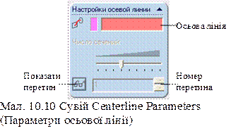 Сувій Start/End Tangency (Дотична на початку/кінці) у менеджері властивостей елемента по перетинах призначений для завдання дотичної на початку і наприкінці елемента Сувій Options (Параметри) у менеджері властивостей елемента по перетинах надає безліч способів поліпшити створення елемента по перетинах. Сувій Centerline Parameters (Параметри осьової лінії) використовується для створення елемента по двох і більше перетинах уздовж певної траєкторії. Траєкторія, що визначає перетворення, називається осьовою лінією. Сувій Centerline Parameters (Параметри осьової лінії) наведений на мал. 10.10.