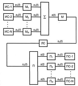 В заключение отметим, что в системах CDMA с ППРЧ в меньшей степени проявляется проблема динамического диапазона принимаемых сигналов. Это связано с тем, что в различных «активных» каналах крайне редко одновременно используются одни и те же рабочие частоты. Она возникает лишь в случае недостаточной частотной избирательности фильтров. ОСНОВЫ ТЕОРИИ МНОГОКАНАЛЬНОЙ ПЕРЕДАЧИ СООБЩЕНИЙ 5.1. СИСТЕМА МНОГОКАНАЛЬНОЙ СВЯЗИ Высокая стоимость линий связи обуславливает разработку систем и методов, позволяющих одновременно передавать по одной линии связи большое число независимых сообщений, т.е. использовать линию многократно. Такие системы связи называют многоканальными. Связь, осуществляемую с помощью этих систем, принято называть многоканальной. Практически все современные системы связи за редким исключением являются многоканальными. В современных сетях связи используются аналоговые и цифровые системы передачи (СП) с тенденцией постепенного перехода к применению только цифровых систем. Однако предстоит длительный период сосуществования на сетях связи аналоговых и цифровых систем, когда большое число соединений будет устанавливаться с использованием обеих технологий. Для обеспечения в этих условиях заданных характеристик каналов и трактов, гарантирующих высокое качество передачи информации, принципы проектирования цифровых и аналоговых систем передачи должны быть совместимы. Используемые методы разделения каналов (РК) можно классифицировать как линейные и нелинейные (комбинационные). В большинстве случаев разделения каналов каждому источнику сообщения выделяется специальный сигнал, называемый канальным. Модулированные сообщениями канальные сигналы объединяются, в результате чего образуется групповой сигнал. Если операция объединения линейна, то получившийся сигнал называют линейным групповым сигналом. Для унификации многоканальных систем связи за основной или стандартный канал принимают канал тональной частоты (канал ТЧ), обеспечивающий передачу сообщений с эффективно передаваемой полосой частот 300...3400 Гц, соответствующей основному спектру телефонного сигнала. Многоканальные системы образуются в результате объединения каналов ТЧ в группы, обычно кратные 12 каналам. В свою очередь, часто используют «вторичное уплотнение» каналов ТЧ телеграфными каналами и каналами передачи данных. На рис. 5.1 приведена структурная схема наиболее распространенных систем многоканальной связи. Реализации сообщений каждого источника a 1(t), a 2(t), …, aN (t) с помощью индивидуальных передатчиков (модуляторов) M 1, M 2, …, MN преобразуются в соответствующие канальные сигналы s 1(t), s 2(t), …, sN (t). Совокупность канальных сигналов на выходе суммирующего устройства S образует групповой сигнал s (t). Наконец, в групповом передатчике M сигнал s (t) преобразуется в линейный сигнал sл (t), который и поступает в линию связи ЛС. Допустим, что линия пропускает сигнал практически без искажений и не вносит шумов. Тогда на приемном конце линии связи линейный сигнал sл (t) с помощью группового приемника П может быть вновь преобразован в групповой сигнал s (t). Канальными или индивидуальными приемниками П1, П2, …, П N из группового сигнала s (t) выделяются соответствующие канальные сигналы s 1(t), s 2(t), …, sN (t) и затем преобразуются в предназначенные получателям сообщения a 