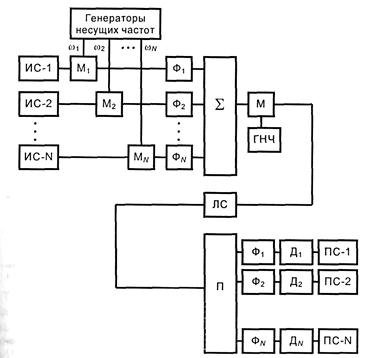 Рис. 5.1. Структурная схема систем многоканальной связи В общем случае групповой сигнал может формироваться не только простейшим суммированием канальных сигналов, но также и определенной логической обработкой, в результате которой каждый элемент группового сигнала несет информацию о сообщениях источников. Это так называемые системы с комбинационным разделением. Чтобы разделяющие устройства были в состоянии различать сигналы отдельных каналов, должны существовать определенные признаки, присущие только данному сигналу. Такими признаками в общем случае могут быть параметры переносчика, например амплитуда, частота или фаза в случае непрерывной модуляции гармонического переносчика. При дискретных видах модуляции различающим признаком может служить и форма сигналов. Соответственно различаются и способы разделения сигналов: частотный, временной, фазовый и др. 5.2. ЧАСТОТНОЕ РАЗДЕЛЕНИЕ СИГНАЛОВ Функциональная схема простейшей системы многоканальной связи с разделением каналов по частоте представлена на рис.5.2. В зарубежных источниках для обозначения принципа частотного разделения каналов (ЧРК) используются термины Frequency Division Multiplexing (FDM) и Frequency Division Multiply Access (FDMA). Сначала в соответствии с передаваемыми сообщениями первичные (индивидуальные) сигналы, имеющие энергетические спектры G 1(w), G 2(w), …, GN (w) модулируют несущие частоты wk каждого канала. Эту операцию выполняют модуляторы M 1, M 2, …, MN канальных передатчиков. Полученные на выходе частотных фильтров Ф 1, Ф 2, …, ФN спектры gk (w) канальных сигналов занимают соответственно полосы частот D w 1, D w 2, …, D wN, которые в общем случае могут отличаться по ширине от спектров сообщений W1, W2, …, W N. При широкополосных видах модуляции, например ЧМ, ширина спектра D wk» 2(b +1) wk, т.е. в общем случае D wk > W k. Для упрощения будем считать, что используется амплитудная модуляция с одной боковой полосой (АМ-ОБП) (как это принято в аналоговых СП с ЧРК), т.е. D wk = W и D w = N W.