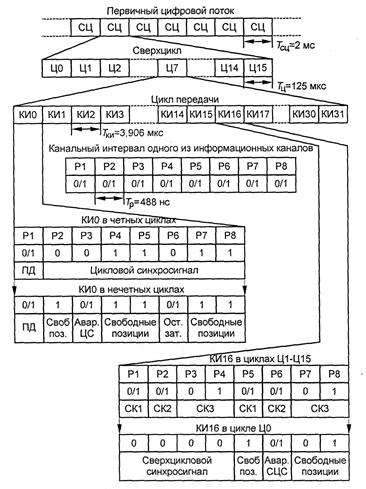 Рис. 9.4. Структура кадра ЦСП ИКМ-30 Очевидно, возможны два случая несоответствия скорости записи объединяемого потока и скорости считывания объединенного потока: - скорость считывания превышает скорость записи – при этом применяется так называемое положительное согласование скоростей (ПСС), представляющее собой вставку (стаффинг) дополнительного бита в объединяемый поток; - скорость считывания меньше скорости записи - при этом применяется так называемое отрицательное согласование скоростей (ОСС), представляющее собой передачу отстающего информационного бита вместо одного из служебных. Операции разделения потоков являются обратными операциям объединения: информация объединенного потока записывается в запоминающие устройства, соответствующие исходным потокам, затем считывается со скоростями, равными скоростям объединяемых потоков. В большинстве случаев объединение потоков осуществляется посимвольно (побитно), т.е. считывание информации из запоминающих устройств при объединении происходит по разрядам: вначале считывается и передается разряд первого потока, затем – второго и так далее, после считывания разряда последнего из объединяемых потоков вновь считывается очередной разряд первого, т.е. цикл повторяется. Возможно объединение потоков и по группам символов. Например, в объединенном потоке можно вначале передать все символы, относящиеся к каналу или циклу передачи первого потока, затем – такую же группу символов второго потока и т.д. Объединение по группам символов требует увеличения объема памяти оперативных запоминающих устройств пропорционально числу объединяемых групп символов. Структура кадра вторичной ЦСП (ИКМ-120) (рис. 9.5) является типичной для всех высших уровней этой иерархии. Цикл передачи имеет длительность 125 мкс и состоит из 1056 позиций. Цикл разделен на четыре субцикла одинаковой длительности. Первые восемь битов первого субцикла заняты комбинацией 11100110, представляющей собой цикловой синхросигнал объединенного потока. Первые четыре бита второго субцикла заняты первыми символами команд согласования скоростей (КСС), а следующие четыре – сигналами служебной связи. Вторые и третьи символы КСС занимают первые четыре бита третьего и четвертого субциклов. Биты 5-8 третьего субцикла используются для передачи сигналов данных (два бита), аварийных сигналов (Ав.) и сигналов вызова (выз.) по каналу служебной связи (по одному биту). В битах 5-8 четвертого субцикла передается информация объединяемых потоков при ОСС. При ПСС исключаются биты 9-12 четвертого субцикла.