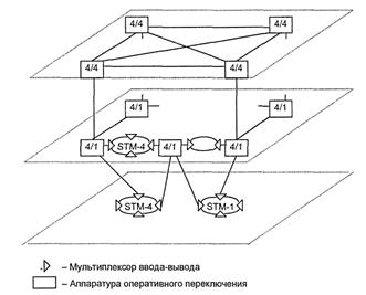 Рис. 9.13. Трехуровневая архитектура сети SDH Верхний (базовый, магистральный) уровень образуется главными узлами, в которых устанавливается АОП 4/4. Основными единицами, которыми обмениваются эти узлы, служат виртуальные контейнеры VC-4. Каждая линия несет по несколько STM-4 или STM-16. Структура сети на этом уровне решетчатая. Средний уровень состоит из нескольких соединительных (региональных) сетей, каждая из которых охватывает определенную территорию. Узлы этих сетей обмениваются не только VC-4, но и более мелкими единицами, например VC-12. Поэтому в узлах пользуется АОП 4/1, а также МВВ. Важнейшие узлы этого уровня выходят на один или несколько узлов верхнего слоя. Структура соединительных сетей может быть и кольцевой, и решетчатой. В линиях организуются тракты STM-4. Нижний уровень составляют сети доступа, куда и включаются основные источники и потребители нагрузки. Каждая из сетей доступа выходит на один или несколько узлов среднего уровня. Структура сетей кольцевая на основе МВВ, тракты STM-1 или STM-4.