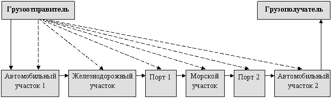 Условные обозначения: Сплошные стрелки – движение груза по логистической цепи в интермодальном сообщении «от двери до двери»; Штриховые стрелки – договорные отношения отправителя (получателя) грузов с оператором смешанной (интермодальной) перевозки; Пунктирные стрелки – договорные отношения оператора смешанной перевозки с участниками логистической цепи по доставке грузов. Логистическая схема организации перевозок грузов в смешанном сообщении без участия логистических посредников, когда все договорные обязательства по доставке грузов, включая передачу с одного вида транспорта на другой, берет на себя грузоотправитель (рис.7).