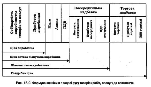 Склад роздрібної ціни (Ц) на товари, що містить у собі максимальну кількість елементів, можна записати у вигляді формули: ЦР=С + П + М + А + ПДВ + НП + НТ (16.19) До елементів ціни належать: · собівартість (С), · прибуток (П), · мито (М), · акцизний збір (А), · податок на додану вартість (ПДВ), · посередницько-збутова надбавка (Нп) і · торговельна надбавка (Нт). Аналізуючи склад і структуру ціни, варто більш детально розглянути її елементи. У зв'язку з цим зазначимо, що сутнісні характеристики собівартості продукції підприємства були розглянуті вище, а тому зупинимося на інших елементах ціни.