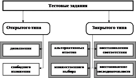 Тестовые задания подразделяются по типам, формам и видам, среди которых можно выделить: