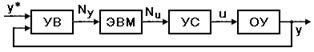 Укрупненная схема цифровой системы управления приведена на рис. 7.1.1. Она содержит управляющую ЭВМ, объект управления ОУ, устройство ввода информации УВ и устройство, предназначенное для сопряжения ЭВМ с объектом, получившие название устройства сопряжения УС. Управляемый процесс (объект), как правило, имеет аналоговую природу, и связанные с ним сигналы у(t) и u(t) являются аналоговыми. Управляющая ЭВМ (а равно и любое другое цифровое устройство) имеет дело только с цифровой информацией, и сигналы на ее входах Ny и выходах Nu представлены цифровым кодом. К современным измерительным устройствам относятся разнообразные датчики аналоговой природы, выходом которых являются электрические сигналы постоянного или переменного тока y(t), кодовые датчики, обеспечивающие получение параллельного цифрового кода Ny, а также импульсные измерительные устройства, на выходе которых получается импульсная последовательность nу. Цифровые измерительные устройства совместимы с цифровыми процессами в управляющей ЭВМ, что упрощает устройства ввода УВ. Центральным элементом системы является управляющая ЭВМ, которая по заданному алгоритму осуществляет обработку информации от измерительных устройств и выполняет функции устройства управления (цифрового регулятора). Важнейшими модельными особенностями управляющей ЭВМ как цифрового регулятора являются ее дискретность, циклический характер обработки информации и наличие запаздывания в процессе обработки сигналов. Дискретность обусловлена квантованием по уровню и времени всех вычислительных процессов, а, следовательно, и дискретным характером сигналов на входе Ny(kT) и выходе ЭВМ Nu(kT). Интервал квантования по времени задается с помощью таймера, а приращение по уровню зависит от разрядности ЭВМ. Для ЭВМ с достаточно большой разрядной сеткой квантованием по уровню обычно пренебрегают. Тогда сигналы Ny(kT) и Nu(kT) рассматриваются как стандартные амплитудно-модулированные импульсные последовательности (решетчатые функции). Запаздывание, вносимое управляющей ЭВМ, вызвано потерями времени на ввод-вывод информации и вычисление управления по заданному алгоритму. С учетом запаздывания выходом ЭВМ следует считать дискретный сигнал Nu(kT-), смещенный относительно идеального сигнала на величину . Для упрощения модели системы запаздыванием либо пренебрегают, либо полагают равным одному интервалу дискретизации с выходным сигналом Nu((k-1)T). В дальнейшем будем полагать, что работа всех устройств цифровой системы синхронизирована и происходит с интервалом дискретности Т, а их разрядные сетки одинаковы. В функции устройств сопряжения с объектом входит промежуточное хранение цифровой информации и (при необходимости) преобразование аналоговых сигналов в цифровые и обратно. Эквивалентная схема цифровой системы управления. Для построения математической модели цифровой системы введем в рассмотрение некоторые специальные блоки: