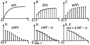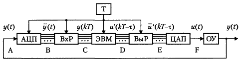 Дискретный сигнал y(kT) поступает в процессор ЭВМ, где производится расчет текущих значений управляющего воздействия. В идеальном случае на выходе ЭВМ (точка D) мгновенно формируется дискретный сигнал u'(kT). С учетом запаздывания - смещенная импульсная последовательность u'(kT-), где <Т, или, полагая для простоты =Т, сигнал u'((k-1)T). В моменты времени t = kT-сигнал с выхода ЭВМ u'(kT-) поступает на выходной регистр ВыР, который обеспечивает его сохранение в течение интервала Т. Тем самым обеспечивается преобразование импульсной последовательности в кусочно-непрерывный сигнал ū'(kT-) (точка Е). Этот элемент схемы является фиксатором. Цифроаналоговый преобразователь, как уже отмечалось, является пассивным элементом и поэтому сигнал на его выходе (точка F) по информационному содержанию совпадает с входным сигналом и является входным сигналом объекта управления.