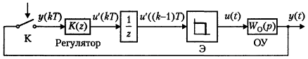 Эквивалентная схема цифровой системы управления, соответствующая ее математической модели для случая линейного объекта управления, линейного регулятора и запаздывания =Т приведена на рис. 7.1.5. В состав схемы входит ОУ с передаточной функцией Wo(p), цифровой регулятор с передаточной функцией K(z), квантователь К, элемент задержки l/z и экстраполятор Э. В общем случае модель может включать каналы задающих воздействий и обратные связи по различным переменным системы. Особенности цифровых систем. Основной особенностью цифровой системы является способ обработки информации в регуляторе (управляющей ЭВМ), который предусматривает использование только арифметических операций и позволяет реализовывать алгебраические алгоритмы управления, включая рекуррентные процедуры решения разностных уравнений. При этом возможность непосредственной реализации динамических алгоритмов управления, записанных в виде дифференциальных либо интегральных уравнений, исключается, и подобные алгоритмы также должны быть приведены к рекуррентной форме. Таким образом, цифровой способ обработки информации вызывает необходимость использования дискретных моделей регуляторов. Учитывая непрерывную природу большинства реальных управляемых процессов, модельная особенность цифровой системы заключается в том, что она является дискретно-непрерывной, и описывается как разностными, так и дифференциальными уравнениями. Сопряжение этих двух частей модели осуществляется с помощью квантователя и экстраполятора нулевого порядка, а также звена запаздывания для учета задержки обработки информации. Указанные выше особенности моделей цифровых систем и их дискретно-непрерывная природа обусловливают основные трудности анализа и проектирования. В связи с этим нашли распространение два подхода к исследованию цифровых систем: • с использование теории непрерывных систем; • с использование теории дискретных систем. Первый подход предусматривает построение непрерывного регулятора, и его последующую дискретизацию. Основной недостаток такого подхода заключается в наличии определенной методической ошибки при замене непрерывной функции y(t) кусочно-постоянной функцией, и не позволяет учесть эффекта запаздывания цифрового регулятора. Тем не менее, этот подход получил широкое распространение ввиду его простоты и возможности достижения хорошего качества процессов при использовании быстродействующих вычислительных устройств с малым значением интервала квантования Т. Второй подход предполагает дискретизацию самого объекта управления, а затем синтез дискретного регулятора. Можно считать его более перспективным, хотя и несколько более сложным.