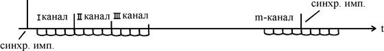 Временное уплотнение применяется в дискретных цифровых системах передачи дискретной информации (СПДИ) и системах с импульсно-кодовой модуляцией (ИКМ). Длительность многоканального сигнала (пакета сигналов от нескольких источников информации) определяется по формуле: TS = tВ× k× m, где tВ - время выборки 1 бита, k - число разрядов в кодовом слове, m - число каналов. Структура сигналов во временной области при временном уплотнении каналов в режиме ИКМ, при передаче m 4-х разрядных символов, показана на рис. 8.3. В последнее время синхронизирующие импульсы не вводят, а разделение по времени выполняется благодаря высокой точности кварцевых тактовых генераторов и первому синхронизирующему импульсу.