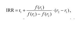 Под нормой рентабельности инвестиции (IRR) понимают значение коэффициента дисконтирования, при котором NPV проекта равен нулю: IRR = r, при котором NPV = f(r) = 0. Смысл расчета этого коэффициента при анализе эффективности планируемых инвестиций заключается в следующем: IRR показывает максимально допустимый относительный уровень расходов, которые могут быть ассоциированы с данным проектом. Например, если проект полностью финансируется за счет ссуды коммерческого банка, то значение IRR показывает верхнюю границу допустимого уровня банковской процентной ставки, превышение которого делает проект убыточным. Если: IRR > СС. то проект следует принять; IRR < СС, то проект следует отвергнуть; IRR = СС, то проект ни прибыльный, ни убыточный. Практическое применение данного метода осложнено, если в распоряжении аналитика нет специализированного финансового калькулятора. В этом случае применяется метод последовательных итераций с использованием табулированных значений дисконтирующих множителей. Для этого с помощью таблиц выбираются два значения коэффициента дисконтирования r1<r2 таким образом, чтобы в интервале (r1, r2) функция NPV=f(r) меняла свое значение с "+" на "-" или с "-" на "+". Далее применяют формулу: