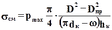 де А - активна площа відповідної висуненої ланки. А = π D² / 4. D - діаметр труби, в яку встановлено кільце; Апр - те ж по відношенню до попереднього кільця; dk - діаметр кола опорного кільця, що перевіряється; hк - діаметр дроту кільця; w - розмір в замку ( просвіт) кільця. Матеріал для кілець Сталь 65Г з термообробкою, [τср] = 0,6[sр]. Тимчасовий опір на розтягування [σр] = 1400-1650 МПа. n=2. Тоді: