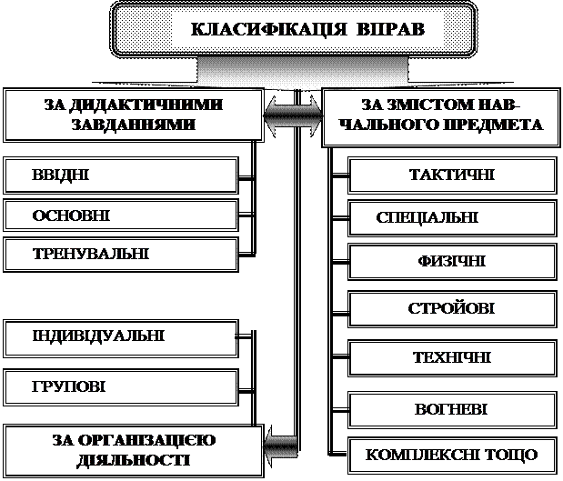 Рис. Основні різновиди вправ Методика виконання вправ за різними предметами, безумовно, відрізняється. Однак, можна визначити загальні умови, які сприяють успішному їх застосуванню: якісна підготовленість суб'єкта навчання, його уміння враховувати індивідуально-психологічні особливості воїнів; розуміння воїнами мети вправи, усвідомлення змісту і послідовності її виконання; підтримання у воїнів постійного інтересу до вправи, усвідомленого ставлення до багаторазових повторень одноманітних дій; суворе дотримання нормативів бойової роботи і постійна організація змагань під час їх здійснення; дотримання доступного ритму, методично правильного чергування дій, що вимагають від воїнів щоразу зростаючого напруження духовних і фізичних сил; послідовність і систематичність у виконанні вправ, поступове підвищення самостійності воїнів під час їх відпрацювання; поступове ускладнення і зміна умов виконання вправ; систематичний контроль за ходом вправ і відповідна постійна допомога воїнам у подоланні труднощів і помилок в їх виконанні; формування у воїнів навичок самоконтролю і самооцінки виконаних дій; наближення умов виконання вправ до бойових умов тощо.