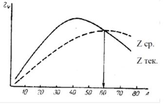 Рисунок 5 – Соотношение между текущим и средним приростами г) текущий, прирост кульминирует по возрасту раньше и по размеру за этот период больше среднего; д) точка пересечения указанных видов прироста или возраст выравнивания их величин определяет собой возраст количественной и качественной спелости древостоя, что имеет, важное значение в практике лесоустройства.