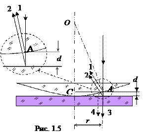 Рассмотрим частный случай явления интерференции – образование колец Ньютона. Для наблюдения интерференционных колец плосковыпуклую линзу большого радиуса кривизны поверхности, положенную выпуклой стороной на стеклянную пластинку, освещают параллельным пучком света. Когерентные лучи 1 и 2 образуются при отражении света от поверхностей воздушного клина между нижней поверхностью линзы и стеклянной пластинкой (рис. 1). Оптическая разность хода отраженных лучей 1 и 2, возникает из-за того, что луч 2, после разделения с лучом 1 в точке А, дважды проходит расстояние d между линзой и пластинкой, да еще теряет полволны при отражении от пластинки. Путь луча 1 от точки разделения А до фронта АВ равен нулю. Разность оптических путей будет равна