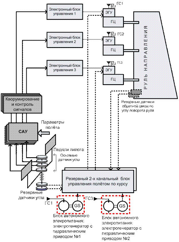 Практика показывает, что такие компенсаторы выравнивают перепады давления в каждом из гидроцилндров около некоторого среднего значения, которое определяется внешней нагрузкой, а именно: АпРнi = Fн/3, Где Ап – эффективная площадь поршня гидроцилиндров рулевых агрегатов. Введение интегратора в цепь управления перепадом давления на поршне существенно повышает точность выравнивания сил и исключает взаимонагружение в статических режимах. Чтобы исключить непрерывные циклические вычисления, связанные с выравниванием сил, подсистема выравнивания сил активна только в том случае, если сигнал рассогласования между средним перепадом давления и перепадом в каждом гидроцилиндре превышает пороговое некоторое значение. Это реализуется путём введения в алгоритм выравнивания сил некоторой зоны нечувствительности. Насыщение каждого канала ЭГРП электроникой неизбежно приводит к снижению безотказности ЭГРП по сравнению с рулевым гидроприводом, имеющим механическое управление. Например, интенсивность отказов электронного блока управления и контроля исправности каждого ЭГРП (без учёта безотказности электронных линий связи и центрального вычислителя системы управления полётом) примерно равна λ=(20-24)*10-6 1/ч., в то время, как интенсивность отказа одного рулевого гидропривода с механическим управлением примерно равна λ=4.76*10-6 1/ч. Поэтому для повышения безотказности системы управления рулевыми поверхностями до уровня систем гидроприводов с механическим управлением необходимо дополнительное резервирование устройств формирования электрических сигналов и систем энергоснабжения. Электронные тракты передачи сигналов управления и электронные блоки преобразования сигналов обладают большими показателями интенсивности отказов, чем механические передачи. Поэтому требуются специальные схемные решения, повышающие уровень безотказности электродистанционных систем управления рулевой поверхностью, особенно односекционного руля направления, который является жизненно важной поверхностью. Отказ управления рулём направления (по курсу) при некотором боковом ветре приводит к катастрофе самолёта. Рассмотрим некоторые схемные решения повышающие безотказность наиболее критичной, как указывалось выше, электродистанционной системы управления – системы управления рулём направления. Практически в качестве приемлемого решения построения системы можно считать электродистанционную систему, которая допускала бы управление полётом после выхода из строя всех штатных систем электропитания и (или) электронных систем управления, например, вследствие удара молнии, воздействия статического электричества, воздействия мощного радиоизлучения, радиационного воздействия или выхода из строя маршевых двигателей самолёта. Проблема повышения безотказности электродистанционной системы (СДУ) управления по курсу до уровня, которым обладает система с механическим управлением и гидравлическими рулевыми приводами с механическим управлением может быть решена следующим путём. 1. Дополнительное резервирование источников электроэнергии с механическим или гидравлическим приводом для обеспечения электропитанием жизненно важных блоков и устройств, обеспечивающих безопасное управление в случае отказа электронных блоков штатной системы управлен