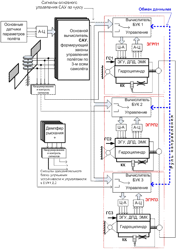 Например, управление по крену может осуществляться с помощью элеронов, универсальных интерцепторов, поверхностями руля высоты, которые отклоняются по командам нескольких взаимозаменяемых вычислителей электрогидравлическими рулевыми приводами (ЭГРП). Однако для управления по курсу по-прежнему используются традиционные высоконадёжные следящие гидроприводы с механическим управлением (РП), которые отклоняют поверхность руля направления.